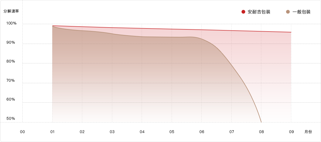 实验证明,采用安耐吉独特设计的新型隔膜瓶包装后,可有效隔离水分和氧气,保证液体类试剂产品的含量稳定性。同一般包装相比,内容产品的分解速率有显著降低,且可以适应长期保存,周分解速率低于0.05%