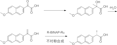 抗炎镇痛药(S)-萘普生(22204-53-1 )的合成----20世纪80年代抗炎镇痛药(S)-萘普生年销售额达10亿美元。有很多研究者 成功地采用了不同的不对称方法合成了(S)-萘普生。其中的一种不对称合成法即采用R-BINAP-Ru为催化体系获得了高立体选 择性(e.e≥98%)和高催化活性。其具体合成路线如右图: